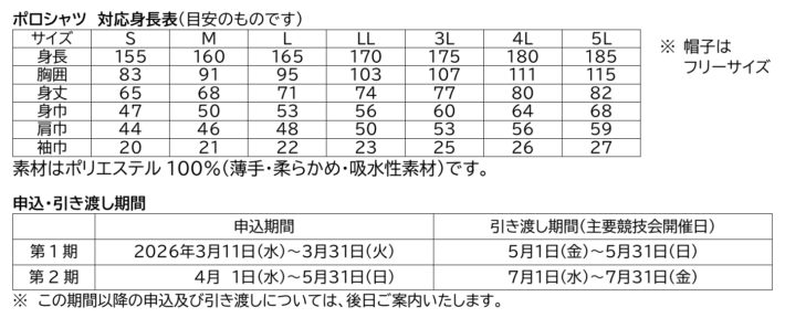 - 価格はポロシャツ 2,500円/着・帽子2,000円/個になります(それぞれ税込み)。